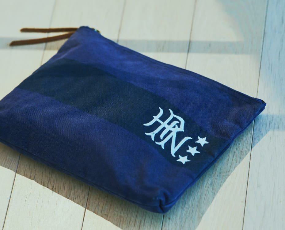 2013年当時、担当していた新規ブランドのオープンノベルティとして製作したポーチです。肌なじみが良く、程よい厚みのあるキャンバス生地に、さりげないプリントと立体的な刺繍を施した、飽きのこないデザインに仕上げました。内側には防水シートを貼るなど、シンプルながらもこだわりと機能性を兼ね備えています。思い出の詰まったこのポーチは、気がつけば10年以上、手元にあり続けています。「用に即した美しいもの」。経年とともに、私にとっては民藝品のような愛着のある存在です。